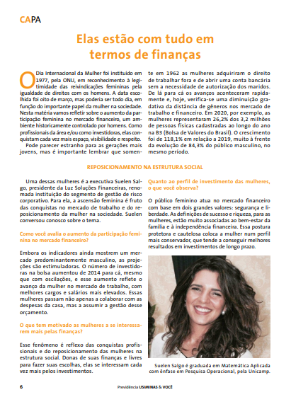 Leia a matéria completa da Suelen Salgo, CEO da LUZ, para a Revista Previdência Usiminas e Você (Março/2021), clicando no link.